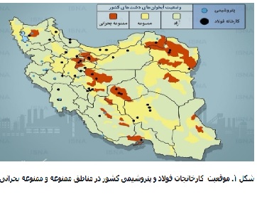 در حدود ۷۰ الی ۸۰ در صد از کارخانجات فولاد و پتروشیمی کشور متاسفانه در د شتها و مناطق ممنوعه و یا ممنوعه بحرانی احداث شده اند.در شکل شماره ۱ موضوع مطرح شده نشان داده شده است. یک کارخانه تولید فولاد جهت تولید نیازمند حجم زیادی از آب شیرین است.ضمنا آب مصرفی یک کارخانه تولید فولاد به عوامل مختلفی از جمله به روز بودن تکنولوژی و یا فرسوده بودن دستگاههای تولید دارد. در رابطه با میزان آب مورد نیاز تولید یک تن فولاد آمارهای مختلفی ارائه شده است و اما بطور کلی برای تولید یک تن فولاد در حدود ۲۳۰۰۰ الی ۲۸۰۰۰ لیتر و یا به عبارتی ۲۳ الی ۲۸ متر مکعب آب نیاز است که در اقصی نقاط کشور، بیشتر این آبهای مورد نیاز در حال حاضر از آبهای زیر زمینی در دشتهای با شرایط ممنوعه یا ممنوعه بحرانی مورد نظر استخراج میشوند.ضمنا کارخانجات تولید فولاد موجود در اقصی نقاط کشور از بیان میزان مصرف آب واقعی خود همیشه امتناع می ورزند.